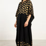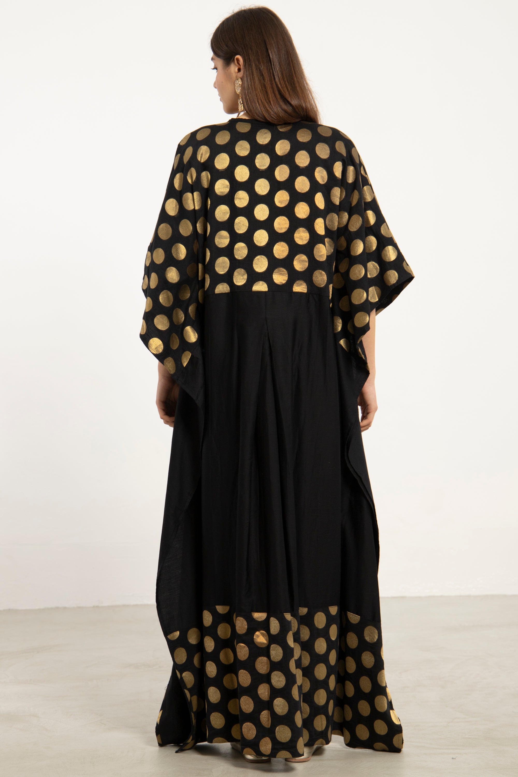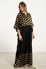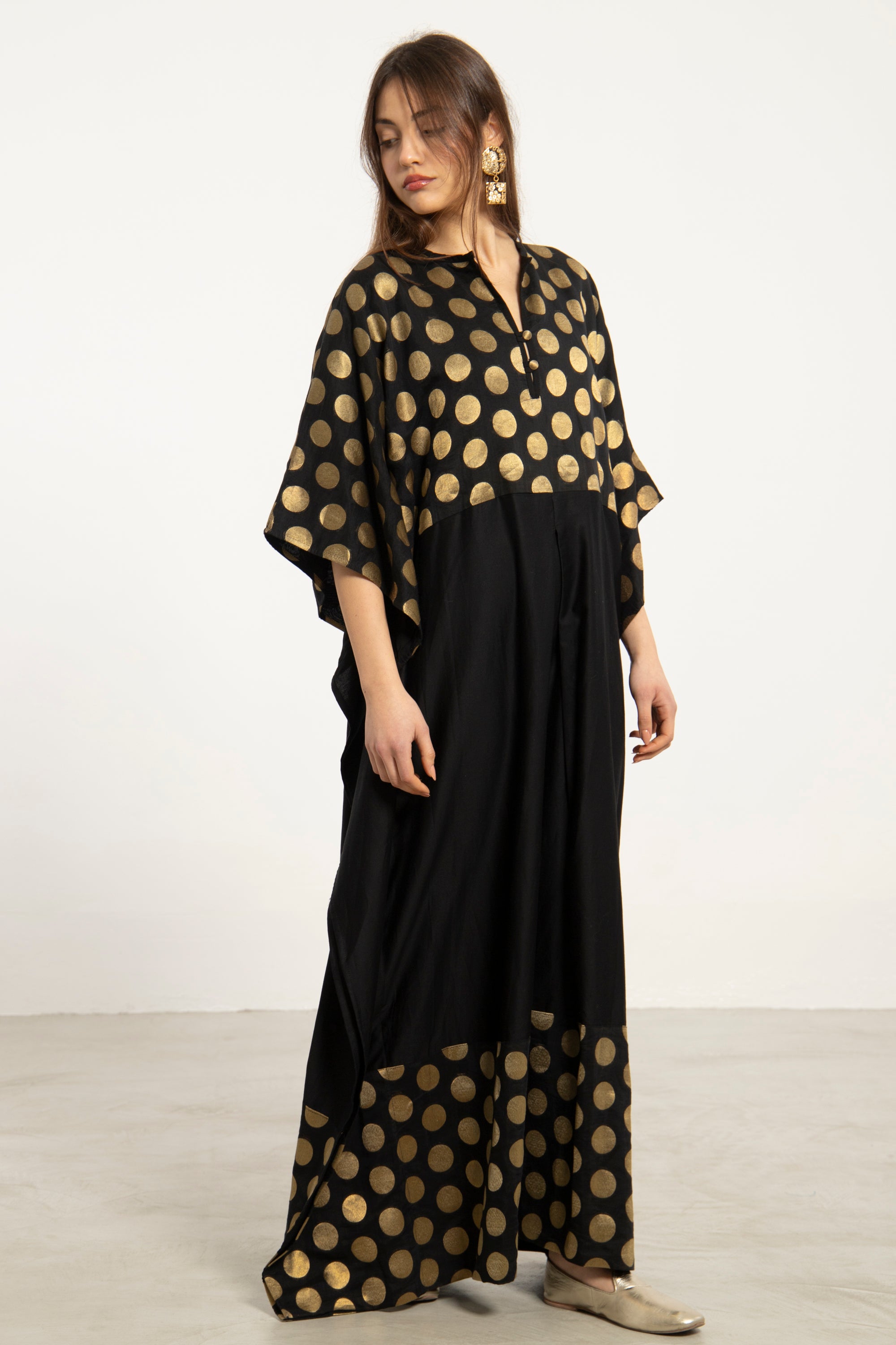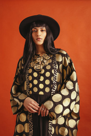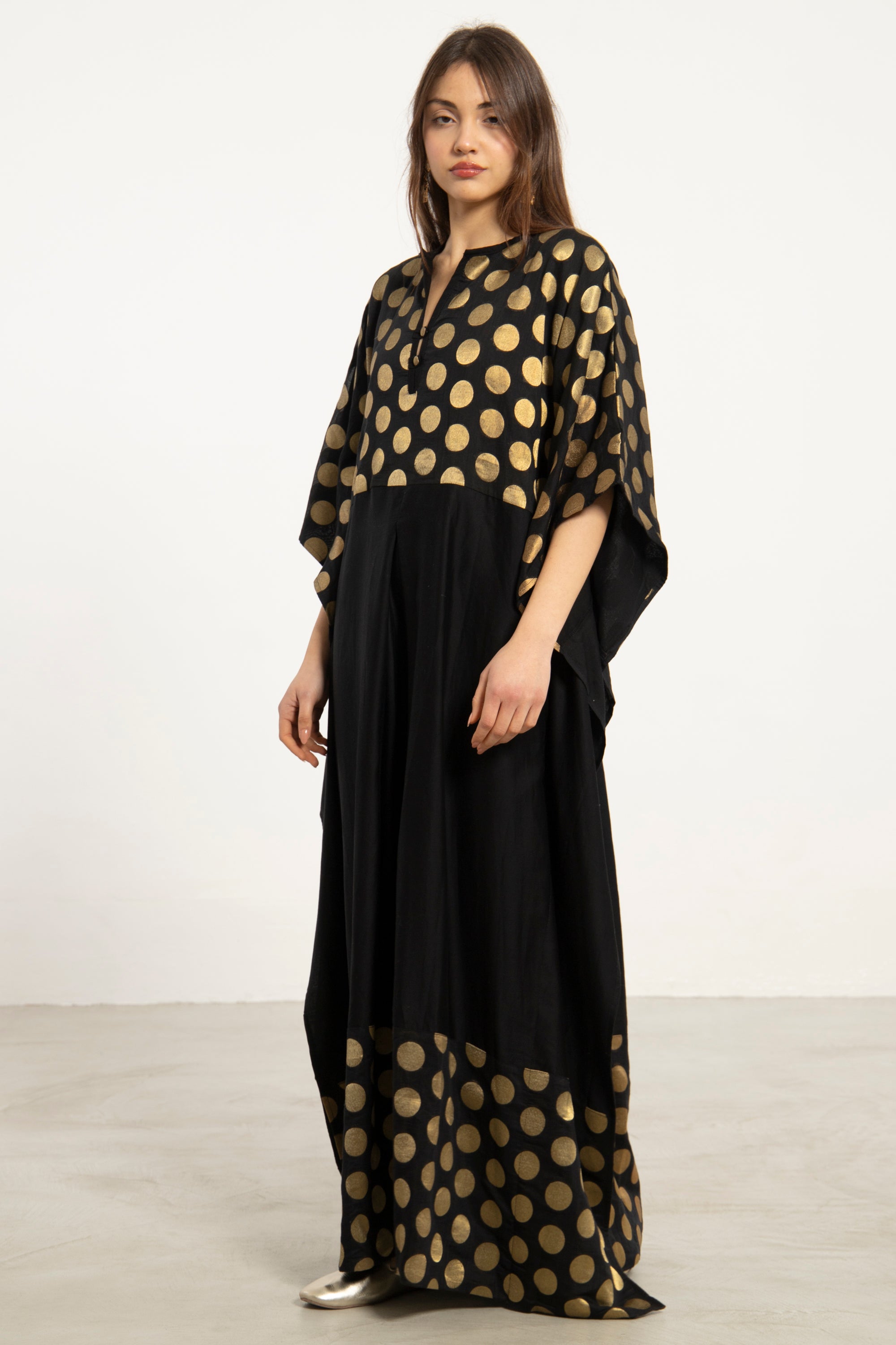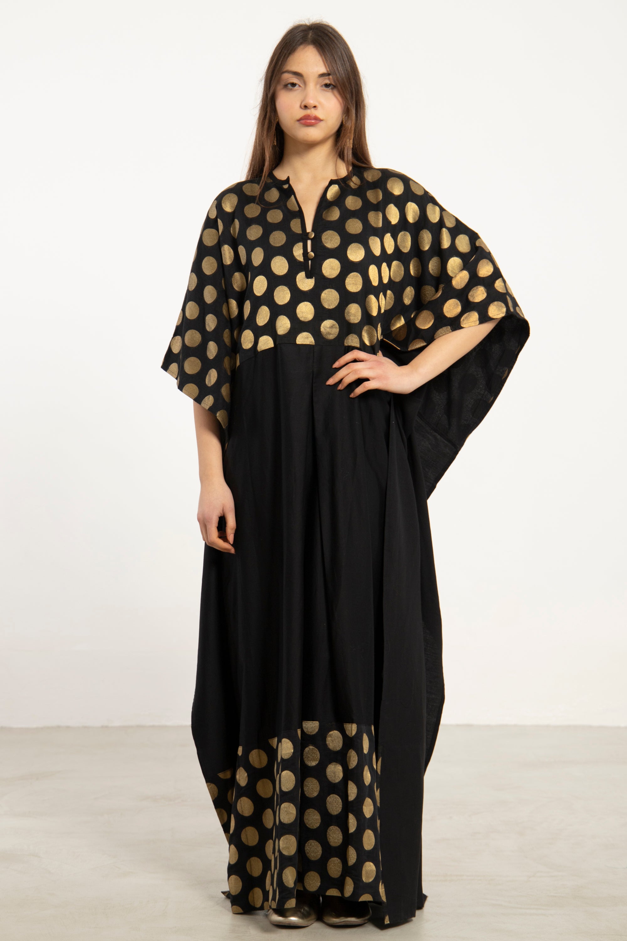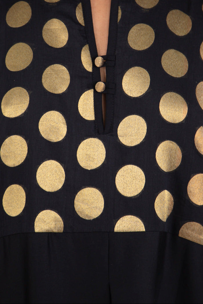 This luxurious handwoven cotton dress features a chic black base adorned with sophisticated gold dots.