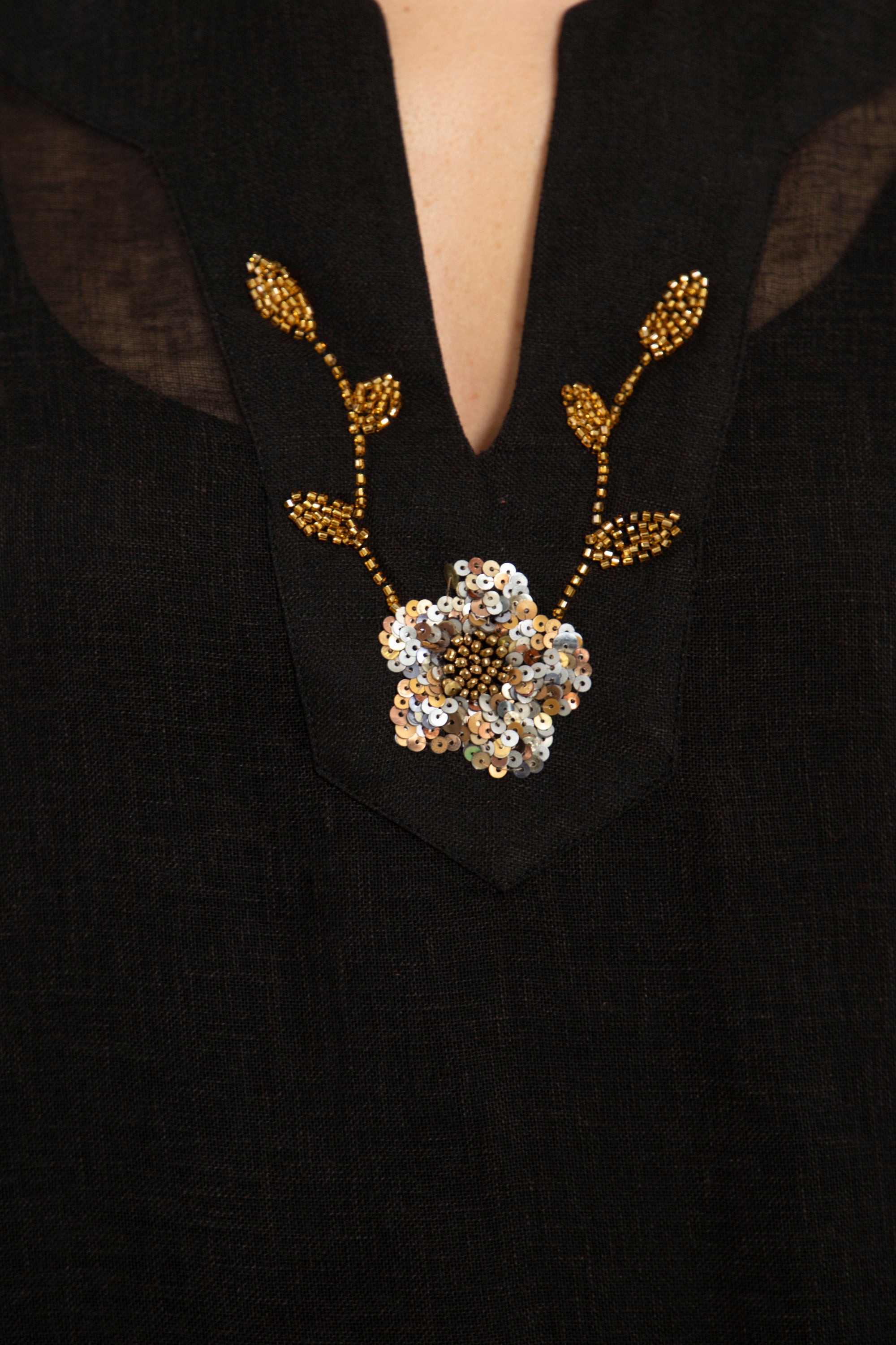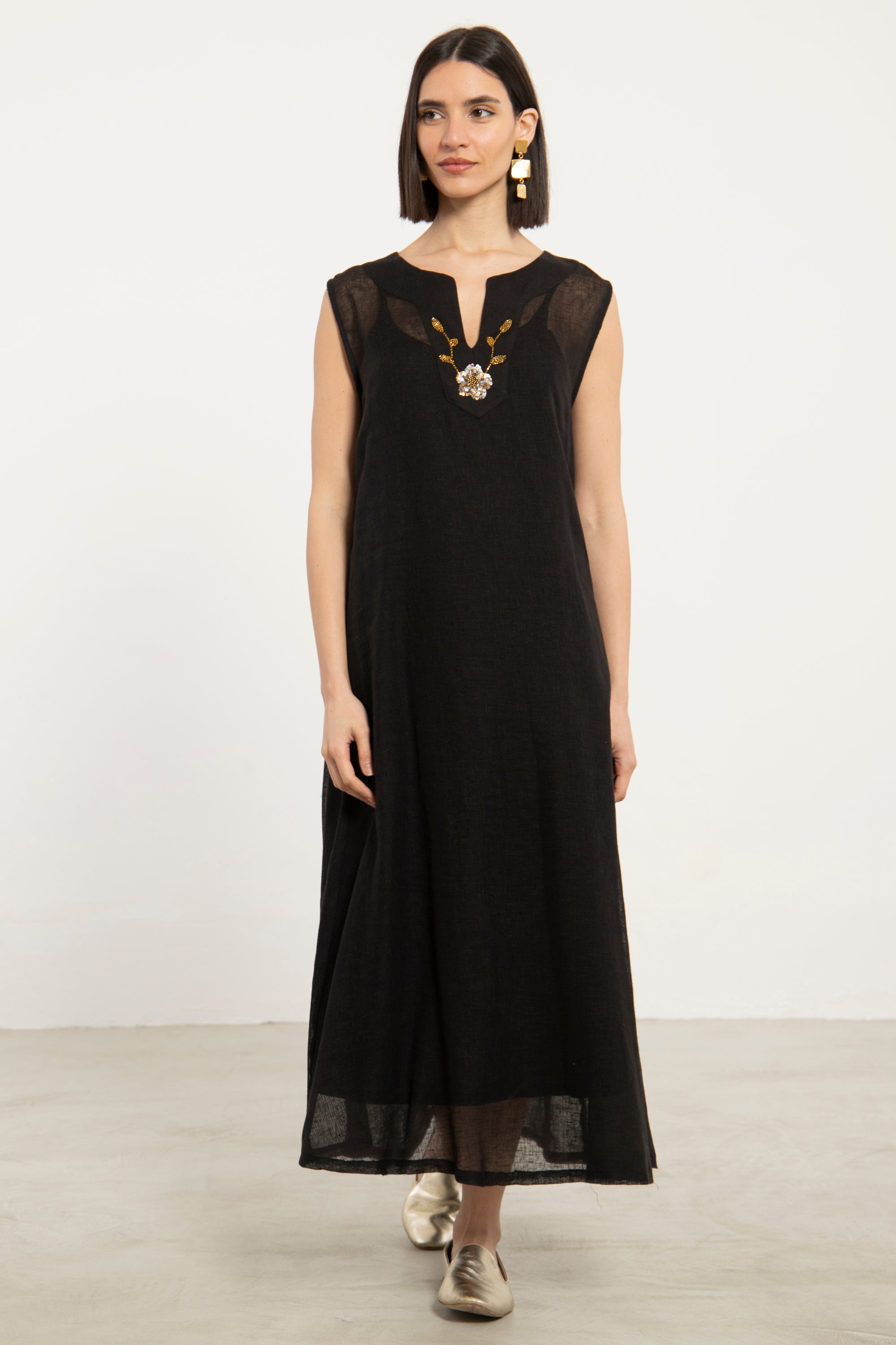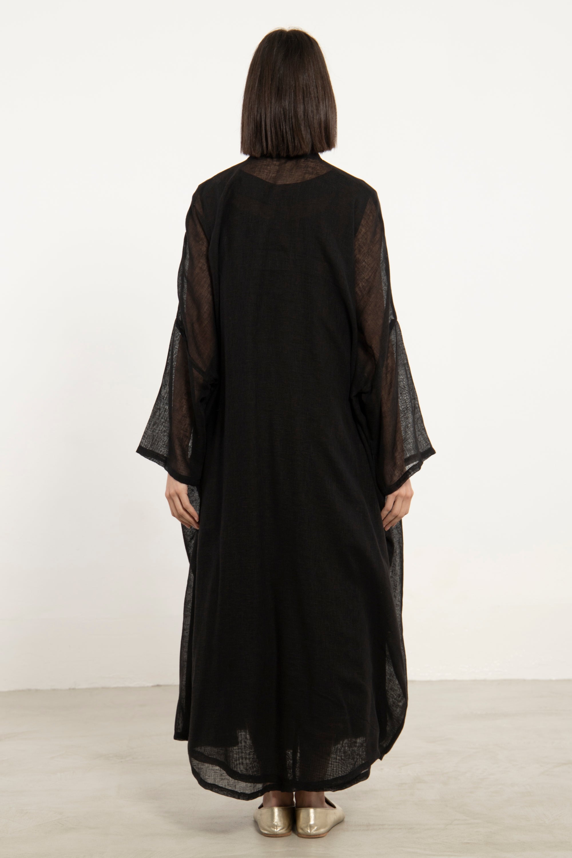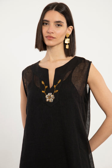 A refined two-piece set crafted in airy linen, combining ease with delicate hand-embroidered detailing. The flowing outer layer enhances movement, while the inner dress offers a clean, structured base.