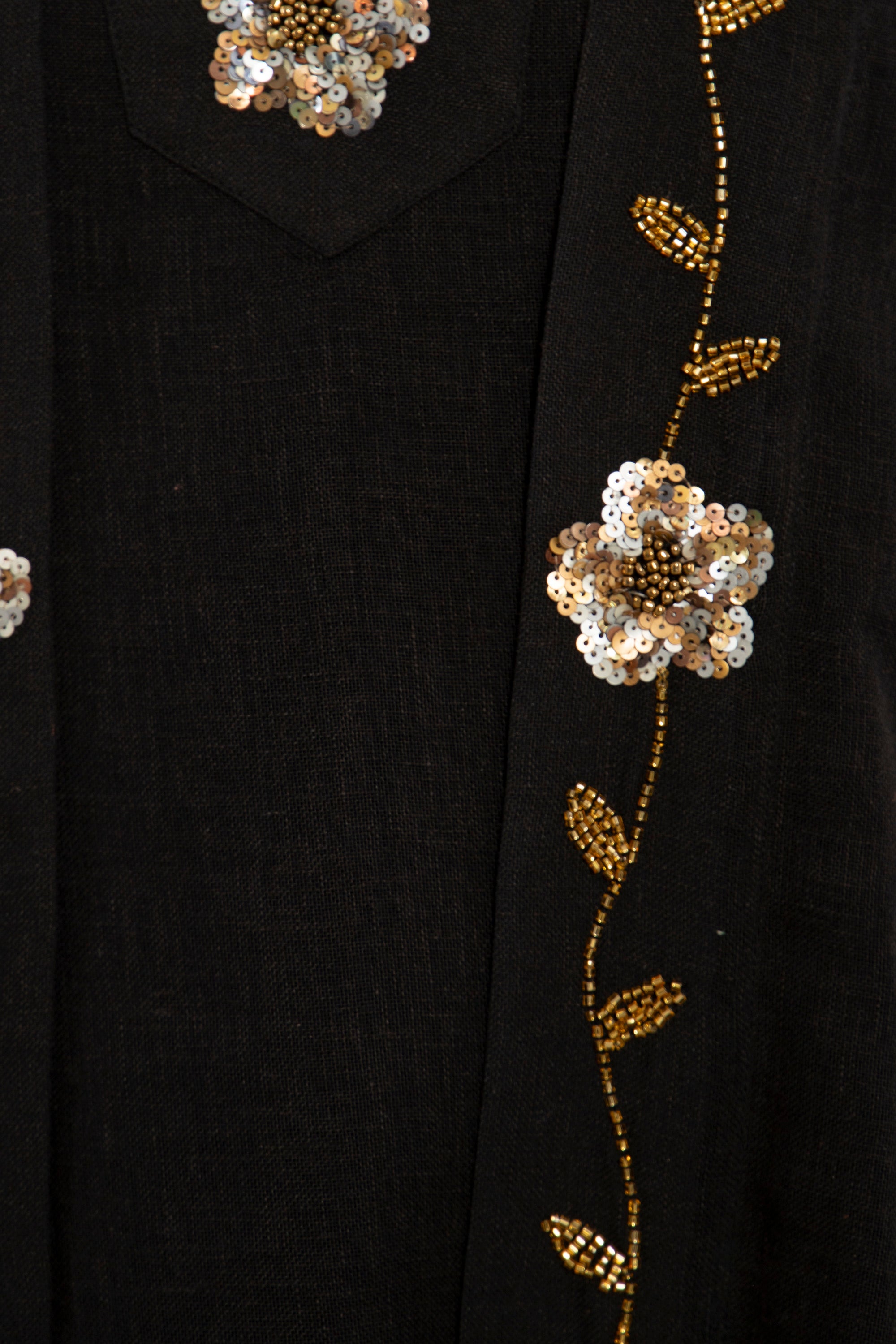 Details: Two-piece set with sleeveless inner dress and open outer layer, hand-embroidered floral motifs along the front, and soft draped silhouette