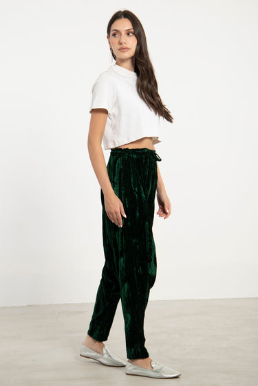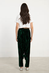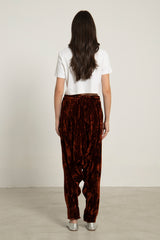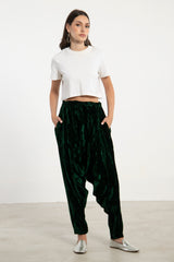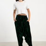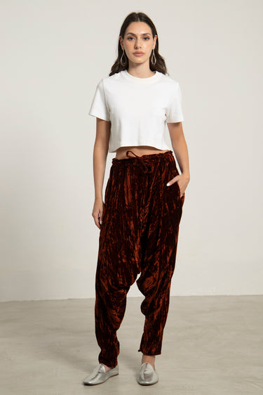 These dropped crotch pants are crafted from pure velvet, featuring a drawstring waistband and slit pockets for your small essential items.