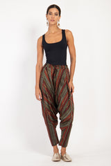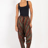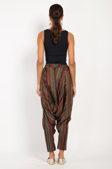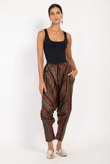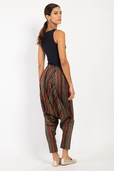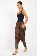 These dropped crotch pants are crafted from soft handwoven pure silk, featuring a drawstring waistband and slit pockets for your small essential items.