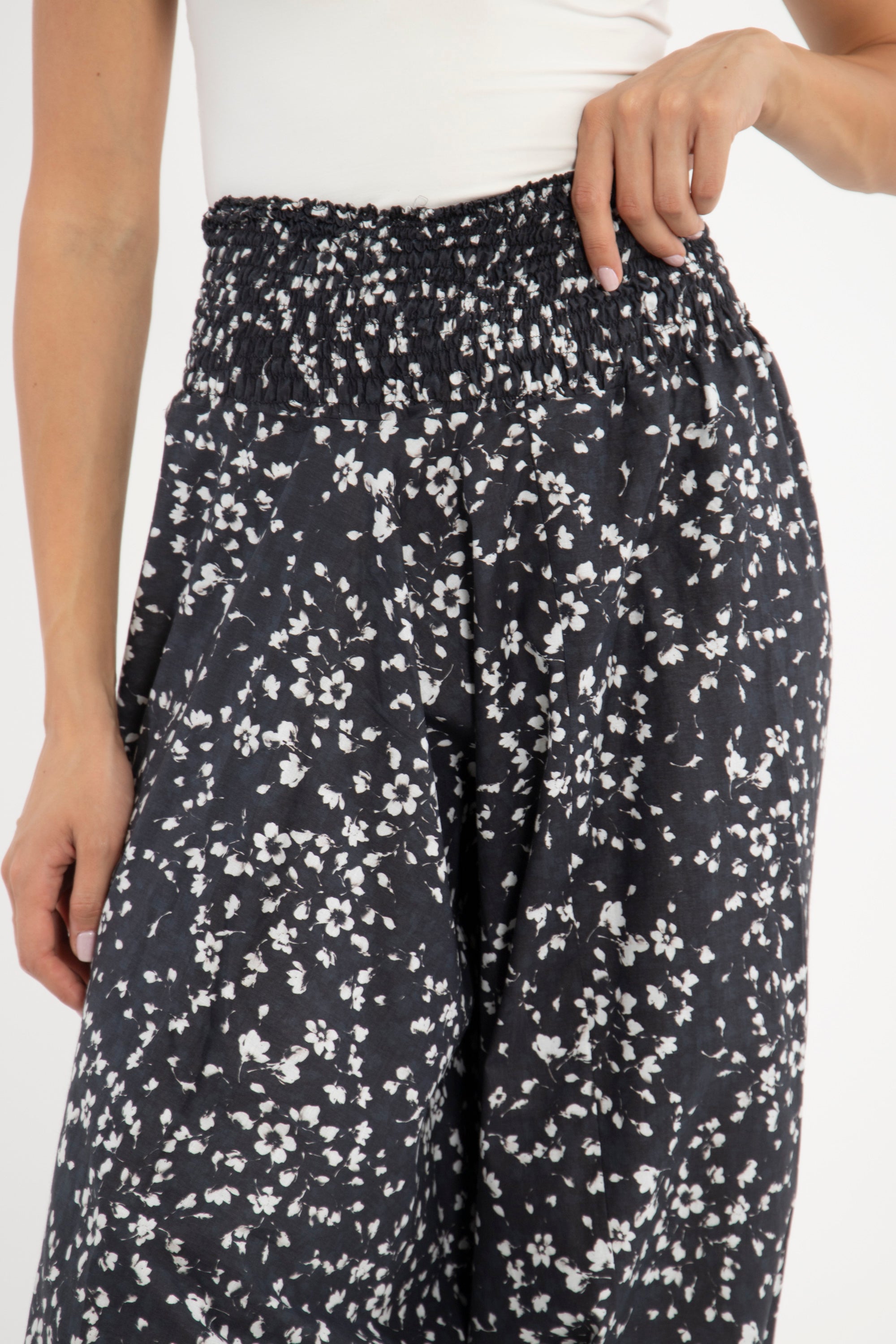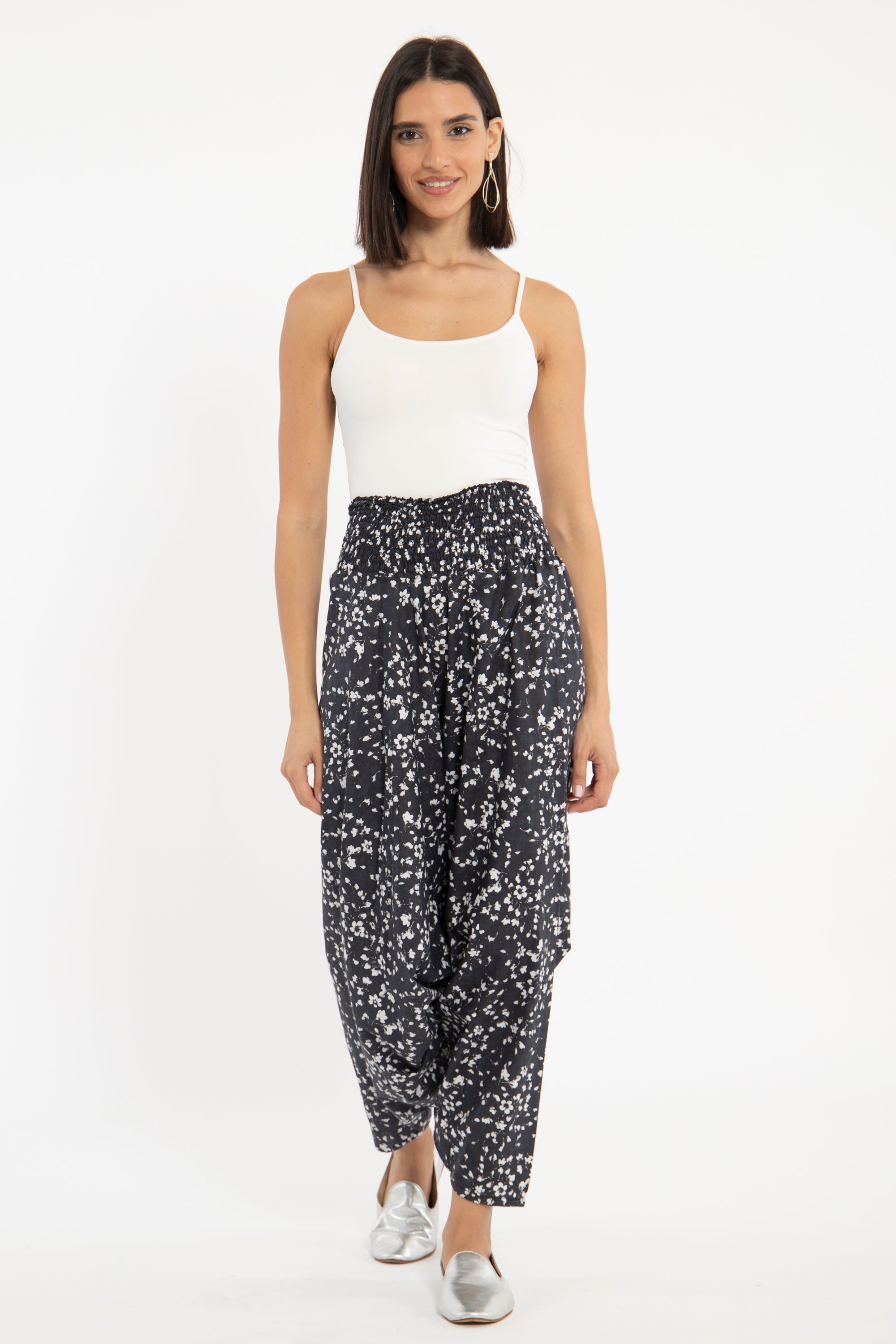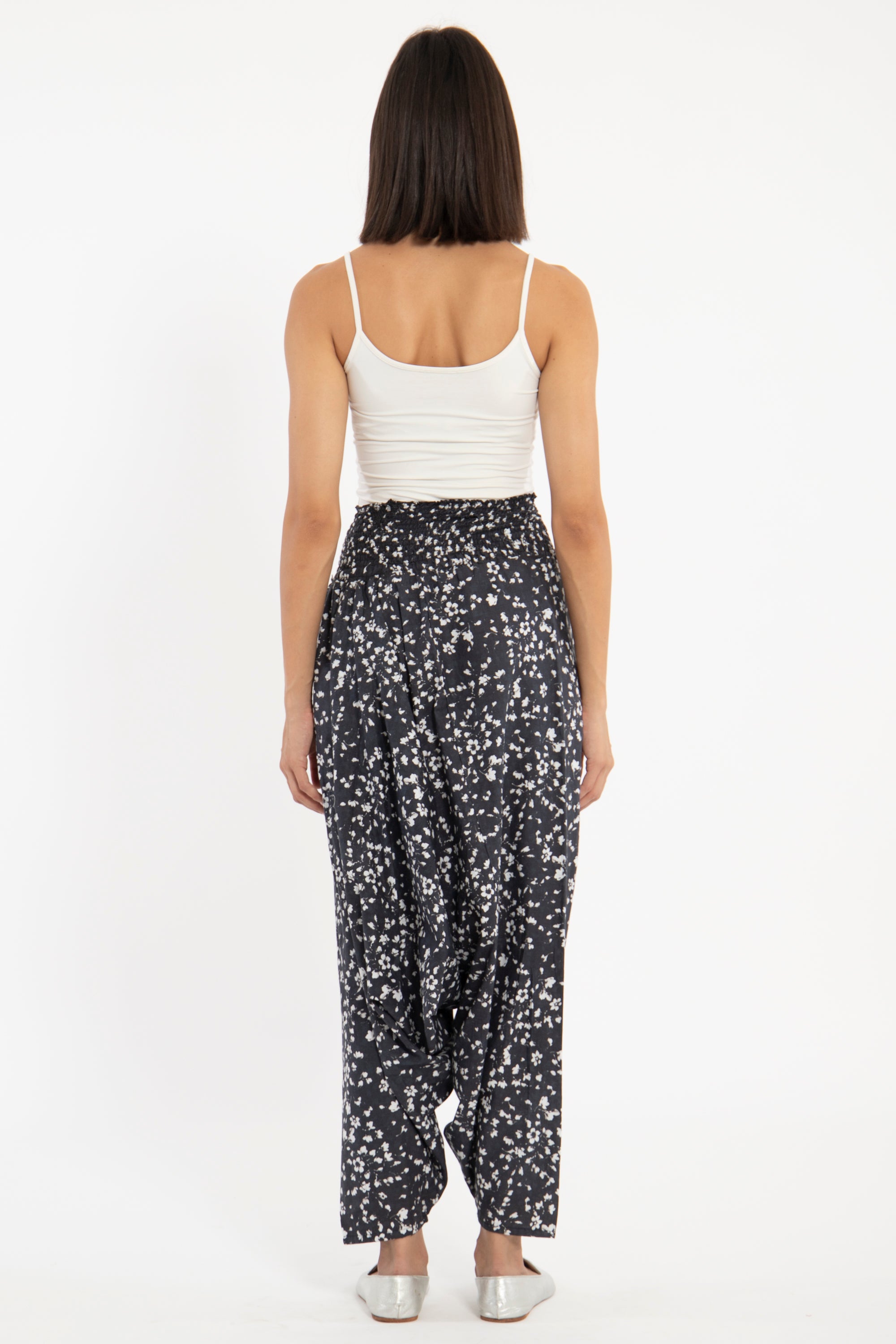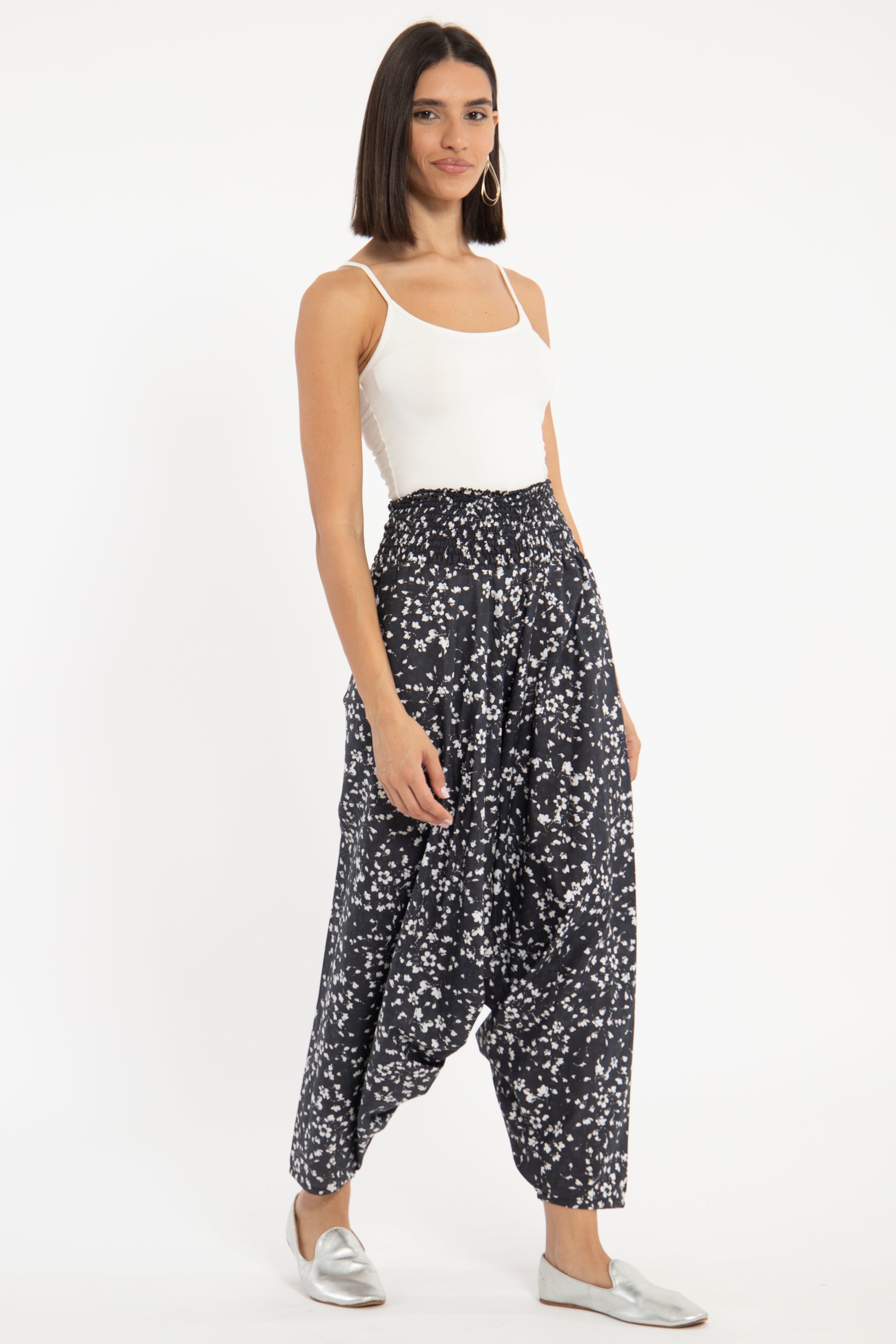 These dropped crotch pants are crafted from lightweight printed cotton, featuring an elasticated waistband and a comfortable fit.