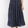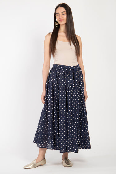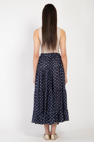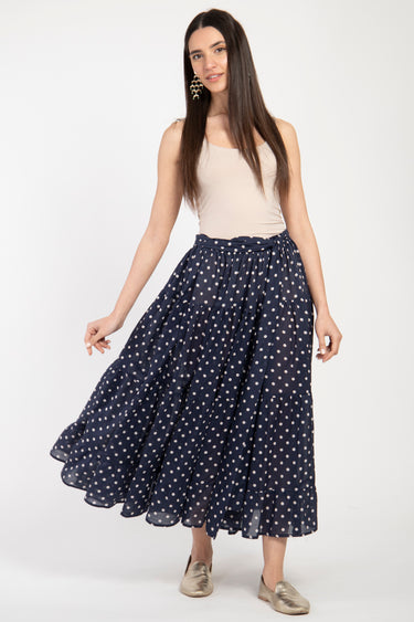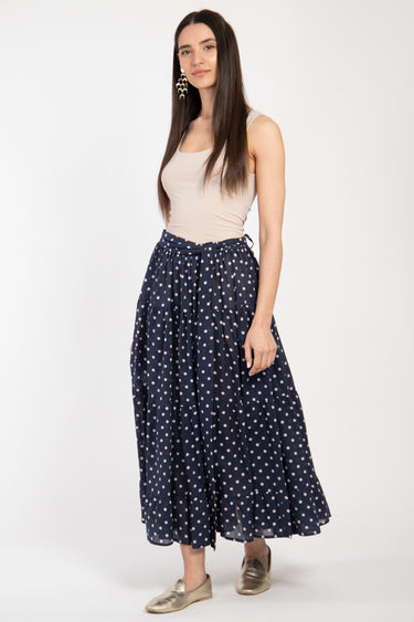 A timeless essential with a playful twist. Crafted from a luxurious blend of cotton and silk, this tiered navy skirt features classic white polka dots and a soft, flowy silhouette. The adjustable waistband tie ensures comfort and versatility, making it a perfect choice for everyday wear or casual outings.