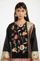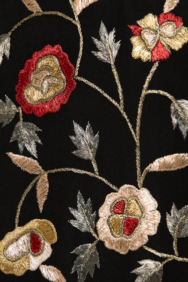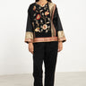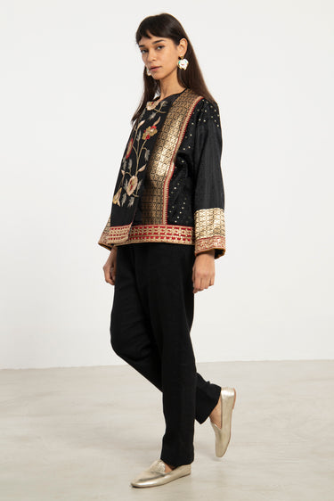 A striking statement piece, the Hanadi Jacket is composed of rich silk jacquard and brocade patchwork. Featuring intricate floral embroidery and geometric motifs, it fuses traditional craftsmanship with a bold, modern silhouette.