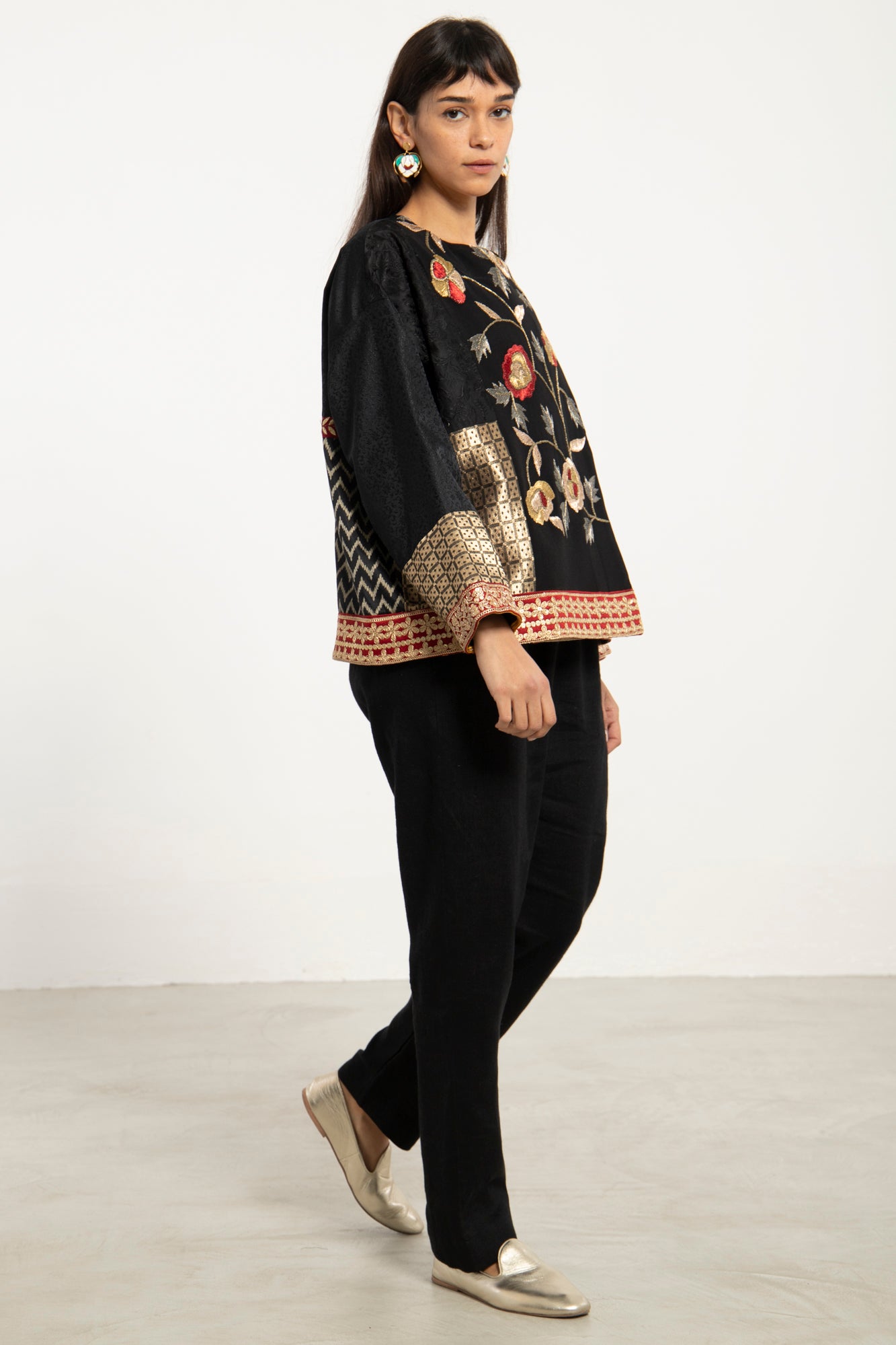 Details: Patchwork front and back, floral embroidery, brocade cuffs and trim, relaxed cut
